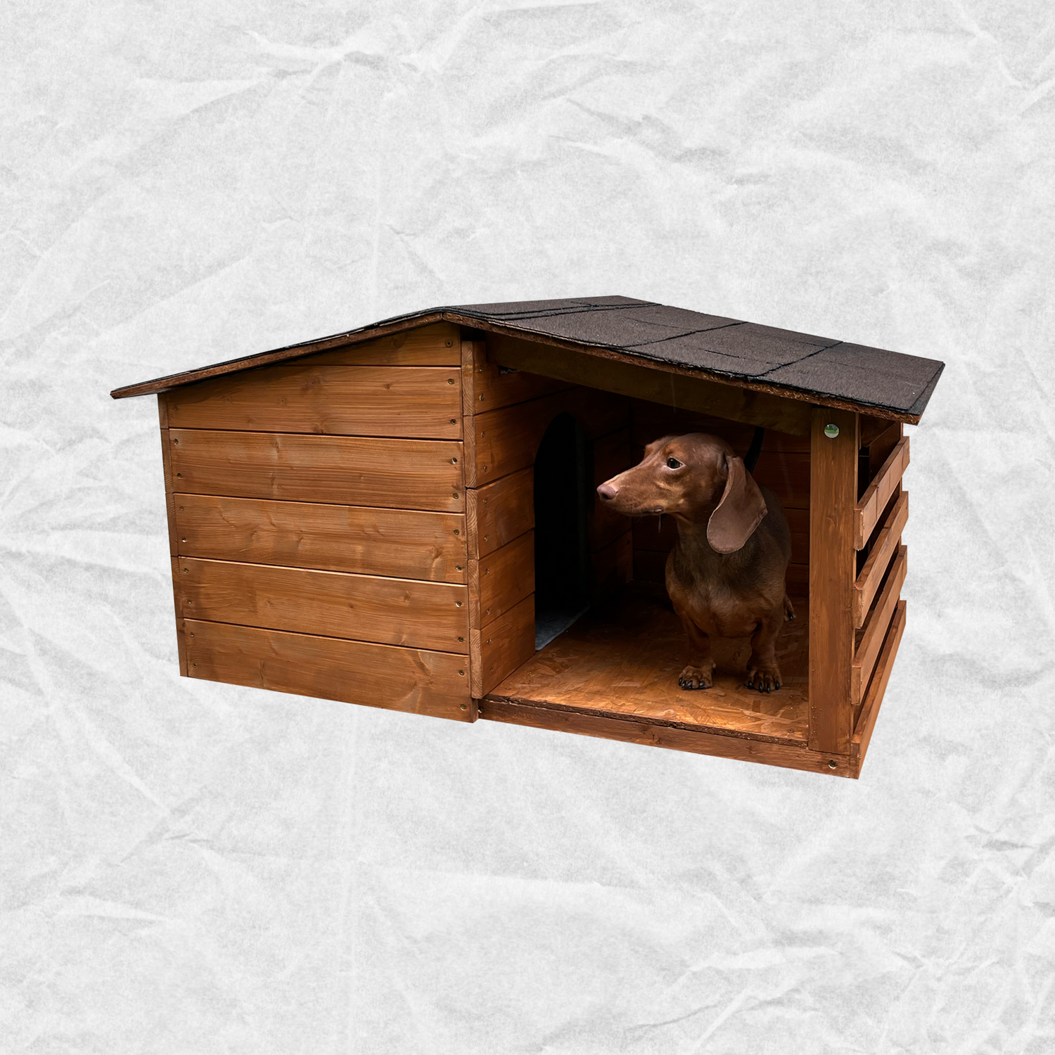 A szigetelt kutyaház ideális választás mindazoknak, akik kényelmes és meleg menedéket szeretnének biztosítani kedvencük számára a hideg napokra. A masszív, strapabíró anyagokból készült ház hosszú távú védelmet nyújt kutyusodnak. A ház teteje teljesen nyitható, így rendkívül egyszerű a tisztítása. A kutyaházhoz terasz is tartozik, amely nyáron ideális menedéket nyújt a nap elől. A gondosan megtervezett, esztétikus megjelenésével pedig bármelyik kert vagy udvar díszévé válik. Igény szerint minden részletet testreszabunk, így garantáltan kedvenced méretéhez és igényeihez tökéletesen illeszkedő házat tudunk biztosítani. Az alábbi modell egy kisebb testű kutya számára tökéletes választás.